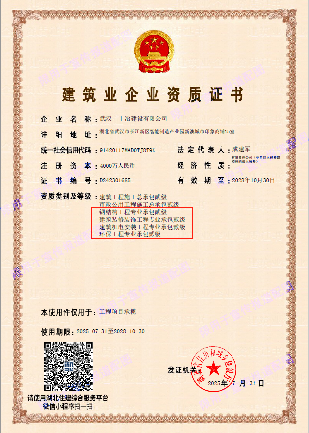 7月31日,武漢二十冶成功獲批鋼結構工程、建筑裝修裝飾工程、建筑機電安裝工程、環保工程四項專業承包貳級資質。