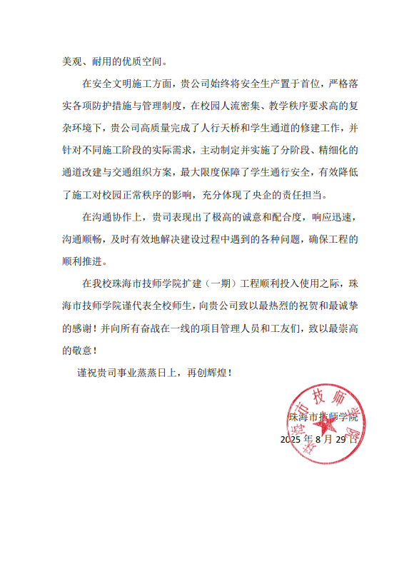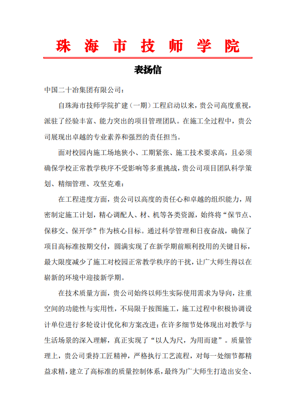 8月29日,廣東二十冶承建的珠海市技師學院擴建(一期)工程順利完成全部建設內容,以高質量標準如期交付。校方第一時間發來表揚信,對廣東二十冶項目團隊在工程建設過程中展現出的卓越管理水平、高度責任擔當及精湛技術工藝予以高度贊譽和衷心感謝。