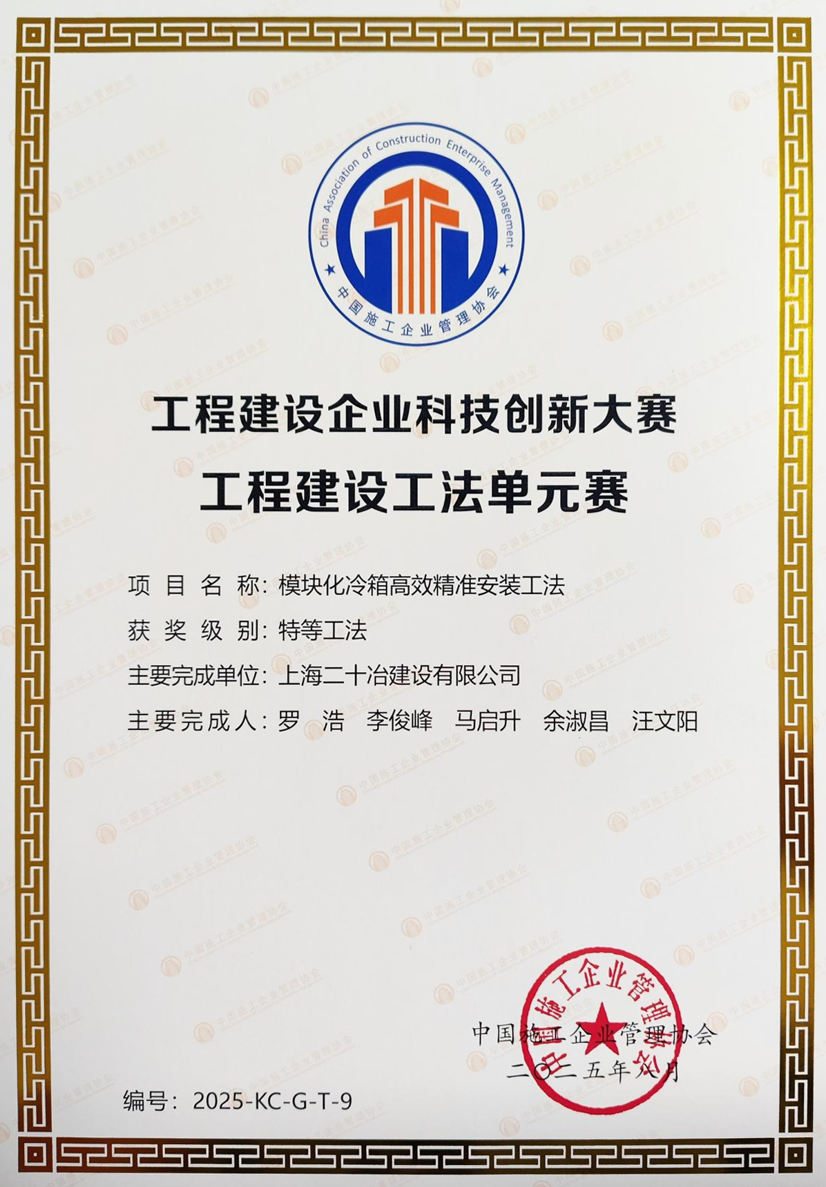 9月8日,由中國施工企業管理協會組織的“第七屆工程建設行業科技創新大會”在江蘇常州召開,上海二十冶申報工法“模塊化冷箱高效精準安裝工法”獲評特等工法,并在專題會議“數字化、工業化、綠色低碳工程建設工法推廣會”上進行現場發布。